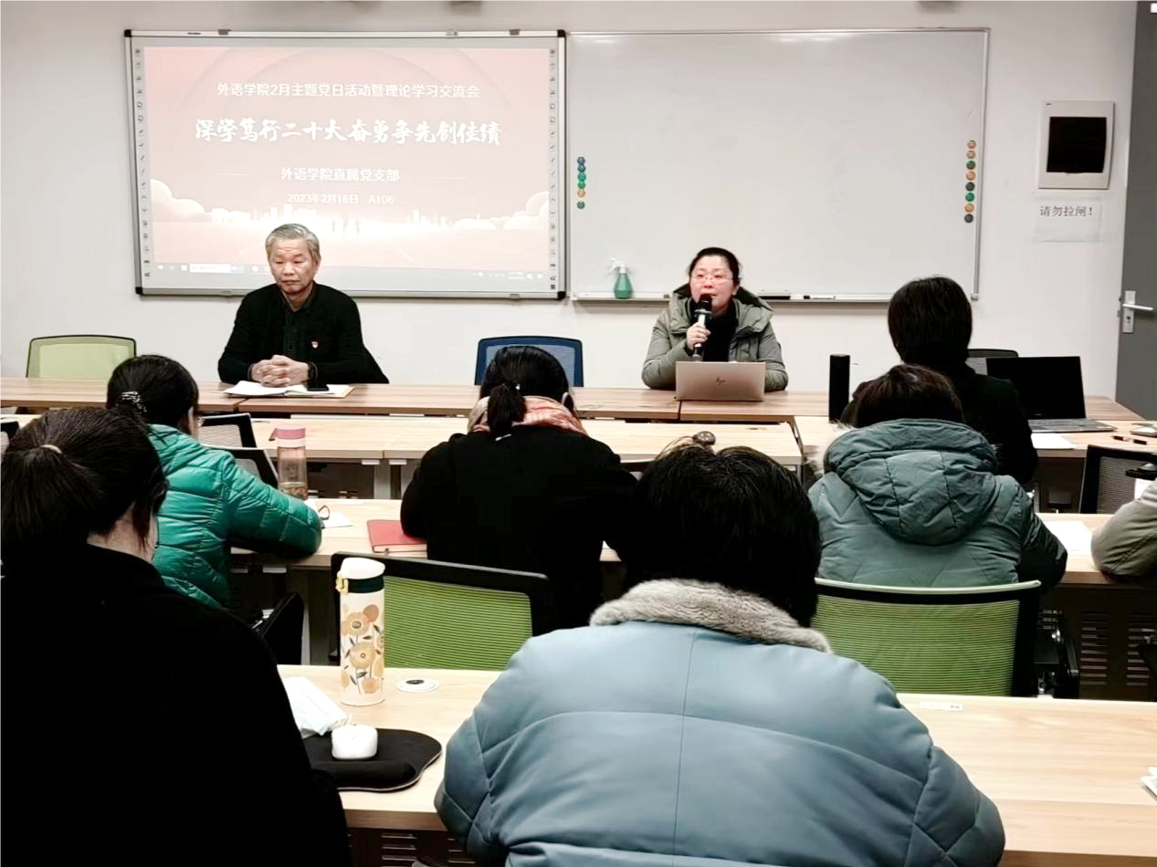 为深入学习贯彻落实党的二十大精神,顺利完成学院在新学期里的各项工作和切实开好2022年基层党组织组织生活会,外语学院直属党支部于2月16日在A106举行“深学笃行二十大 奋勇争先创佳绩”主题党日活动暨理论学习交流会。全体党员共聚一堂,学精神,铸师魂,明方向,开新局。