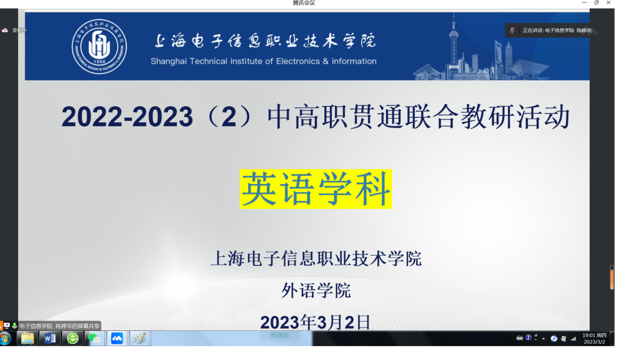 3月2日晚,2022-2023学年第二学期的中高职贯通联合教研活动依托线上腾讯会议平台如期进行,总共17所中职院校的老师们一起参加了联合教研活动。教研活动围绕课程思政在中高职英语学科中的实践、本学期统考考试考纲及考试要求以及英语课程小组研讨三个主题进行。联合教研活动使中高职教师们凝聚了共识,增强了团队凝聚力,为后续贯通英语教学的顺利开展和进一步的中高职合作奠定了良好的基础。(作者 陈婷华 供稿单位 ESP教研室)