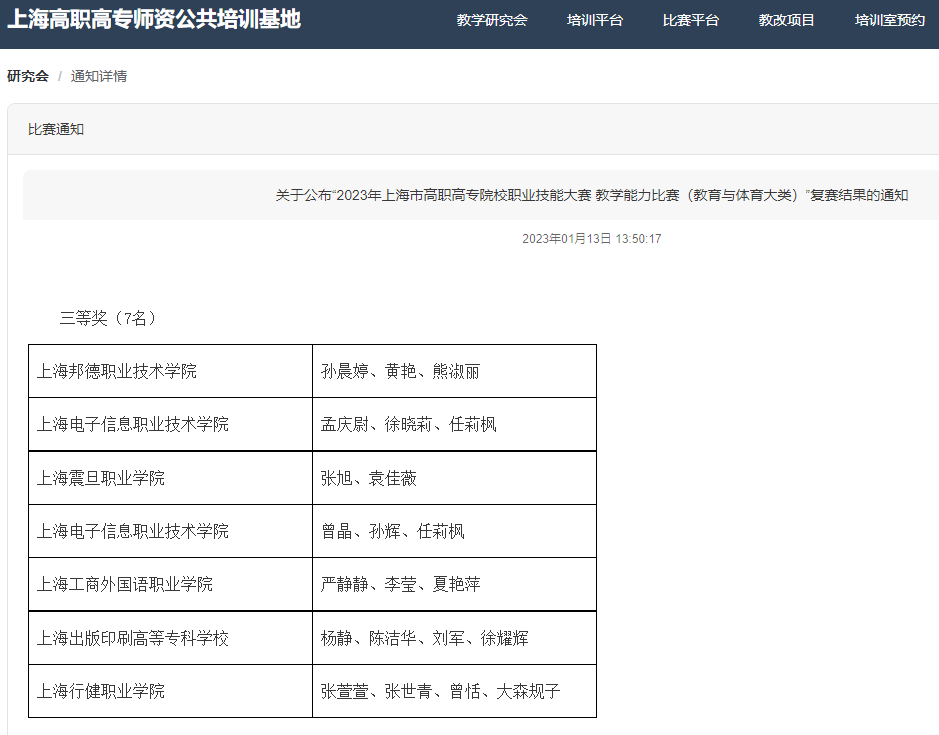 日前,上海市高职高专院校职业技能大赛落下帷幕。外语学院英语系教师曾晶和孟庆尉团队经过初赛和复赛角逐,最终均斩获了三等奖的佳绩。