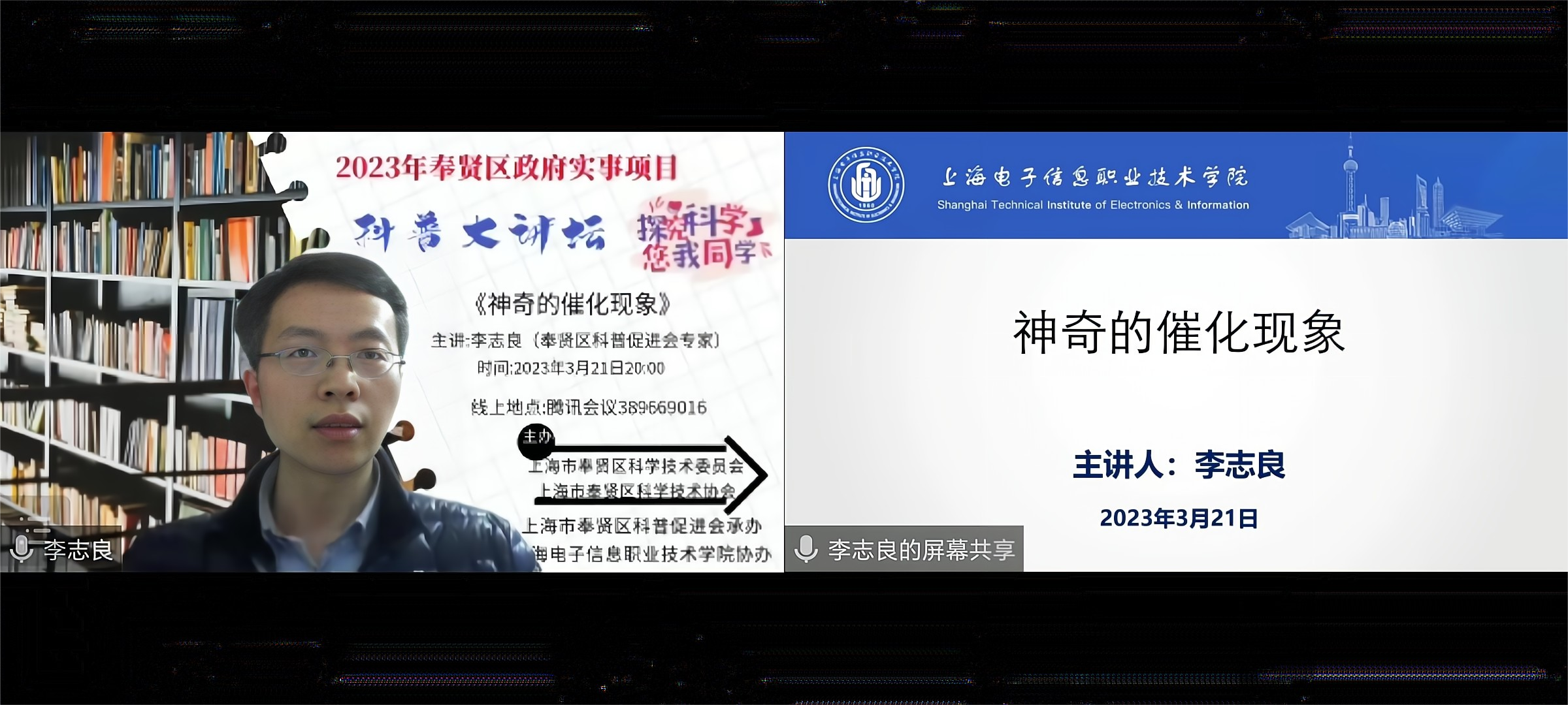 近日,2023年奉贤区政府举行实事项目-科普大讲坛活动,我校作为奉贤地区高校,与上海市奉贤区科普促进会合作,派出骨干教师积极推广科普知识。我院李志良博士作为主讲人,向市民和我校学生作了题为“神奇的催化现象”的专题讲座。