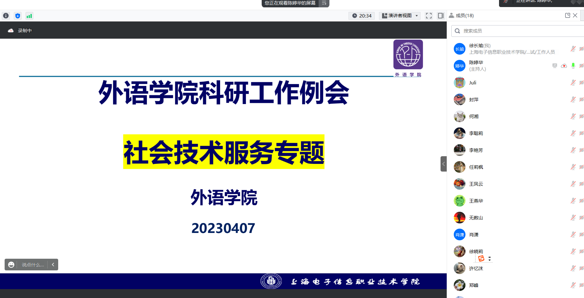 为更好落实学校科研工作会议精神,推进外语学院科研工作扎实开展,2023年4月7日,学院组织全体科研骨干召开了外语学院社会技术服务专题会议。会议由学院科研秘书陈婷华老师主持。