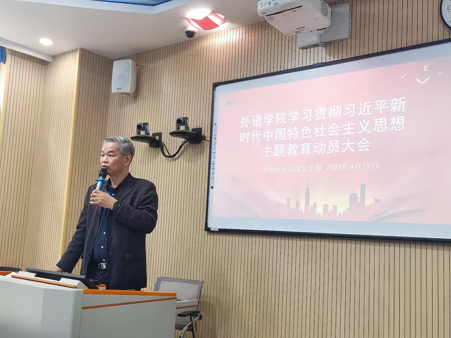 4月19日,外语学院学习贯彻习近平新时代中国特色社会主义思想主题教育动员大会在A110教室和腾讯会议同时召开。学院党支部副书记肖潇主持会议并传达学校党委关于主题教育的部署和要求,学院党支部书记吴亚人做主题教育动员和工作布置,支部全体党员和入党积极分子参会,学校主题教育工作组蒋秋月列席了会议。