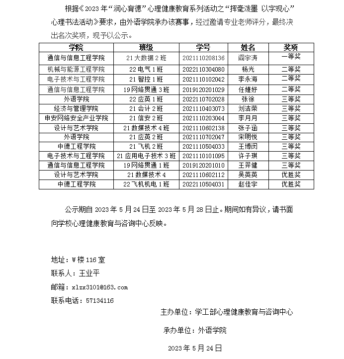 上海电子信息职业技术学院关于“挥毫泼墨 以字现心”心理书法活动比赛获奖公示
