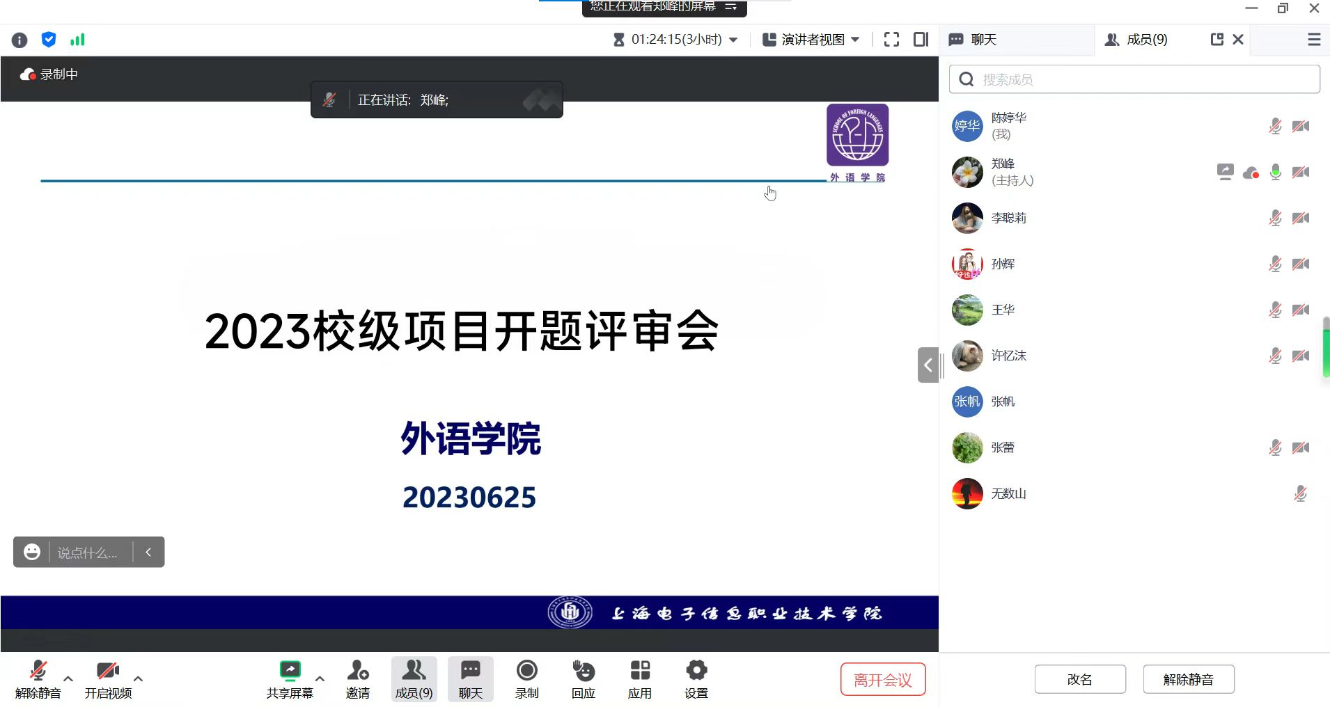 6月25日晚,我院在线举行2023年度校级项目开题评审会。外语学院刘稳良教授、张蕾副教授、李聪莉副教授担任评审专家。全体校级立项课题负责人、课题组成员参会。