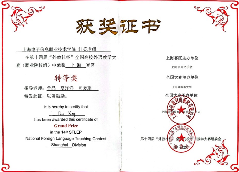 近日,第十四届“外教社杯”全国高校外语教学大赛上海赛区获奖名单揭晓。我校外语学院教师杜英、曾晶、夏洋洋和司梦琪组成的《职场英语》教学团队获上海赛区特等奖,将代表上海赛区参加全国总决赛。