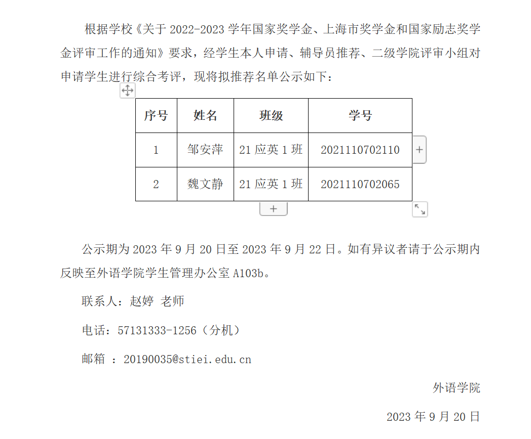 外语学院2022-2023学年国家奖学金、上海奖学金拟推荐名单公示
