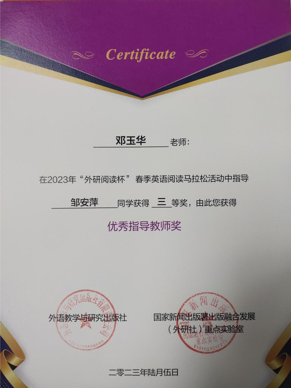 为了迎接“4.23世界读书日”,并让学生们度过一个充满书香的“全国职业教育活动周”,外语学院组织了9名学生参加了外语教学与研究出版社联合国家新闻出版署出版融合发展(外研社)重点实验室大数据外语阅读研究基地举办的2023年第二届“外研阅读杯”春季英语阅读马拉松活动。我院21级英语专业学生邹安萍和本科院校数千名学生同场竞技,脱颖而出荣获三等奖的好成绩。(供稿 教学管理办公室)