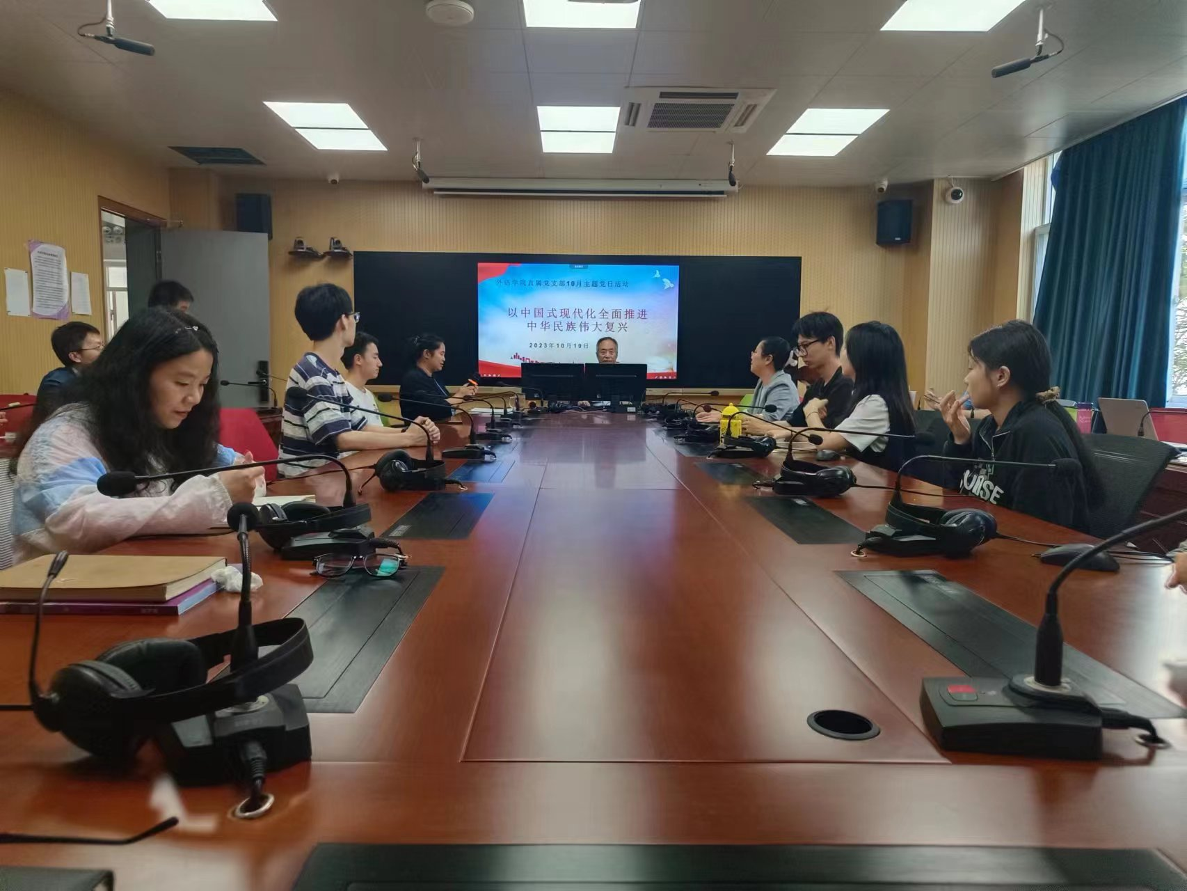10月19日,外语学院直属党支部在A111举行10月主题党日活动,邀请了上海师范大学马克思主义学院教授、博士生导师石书臣作《以中国式现代化全面推进中华民族伟大复兴》辅导报告,学院党支部副书记、院长肖潇主持,支部党员、入党积极分子等三十余人参加了活动。