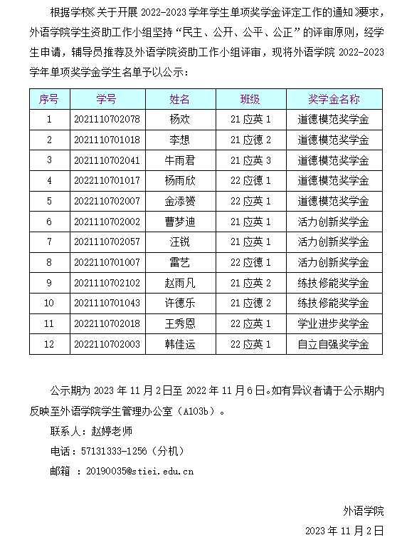 外语学院2022-2023学年单项奖学金初审推荐名单公示