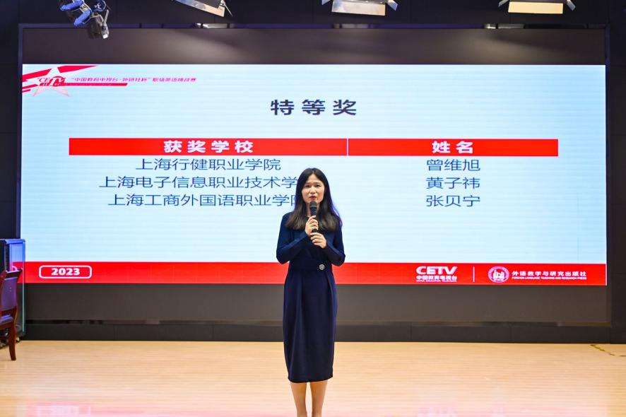 10月29日上午,2023年“中国教育电视台·外研社杯”职场英语挑战赛演讲大赛上海赛区决赛在上海电子信息职业技术学院成功举办。本次挑战赛由中国职业技术教育学会指导,中国教育电视台和外语教学与研究出版社联合主办,上海电子信息职业技术学院外语学院承办。大赛共有近20所高职院校学生参赛。经过激烈角逐,最终有来自13所院校的15名选手脱颖而出,晋级上海市决赛。我校外语学院应用英语专业学生黄子祎在本次大赛中表现优异,斩获特等奖。