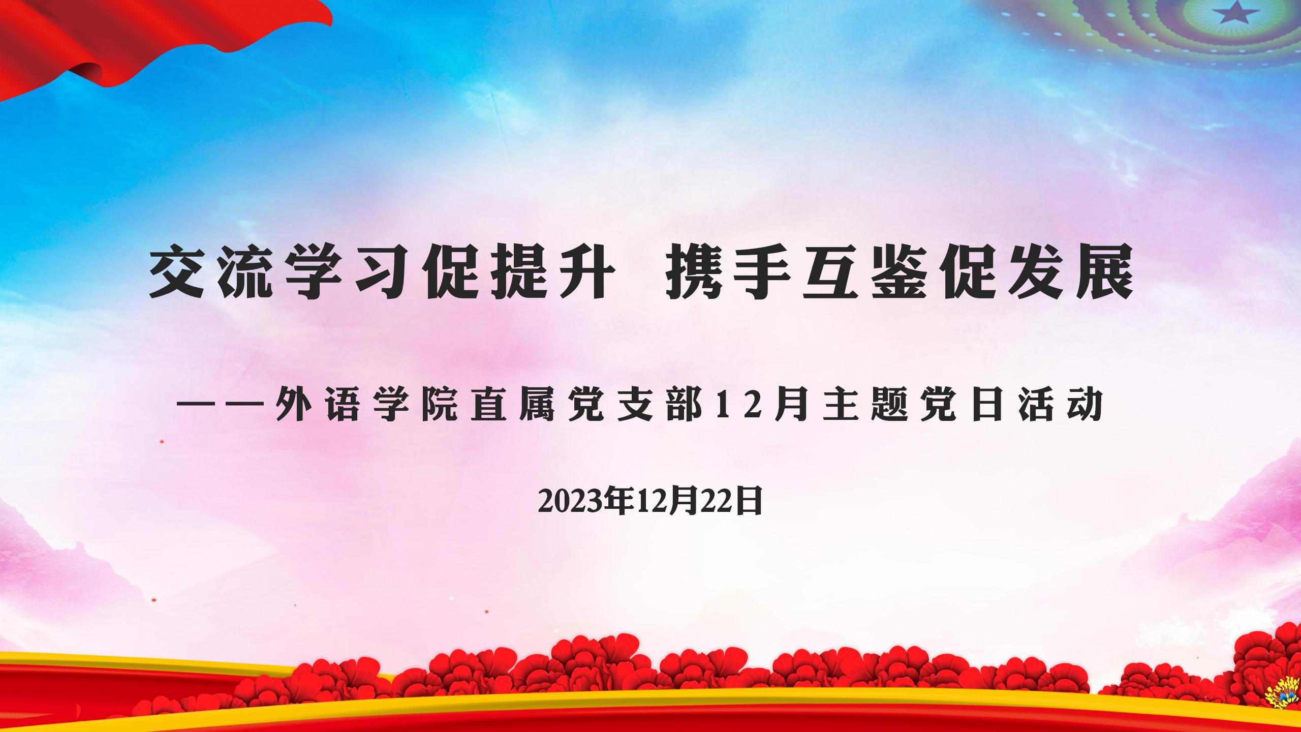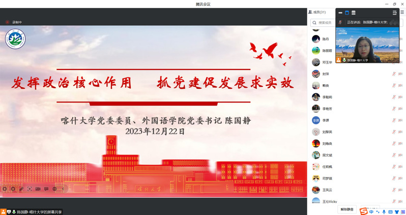 12月22日晚,外语学院直属党支部在腾讯会议举行“交流学习促提升 携手互鉴促发展”主题党日活动。本次活动由学院直属党支部书记吴亚人主持,支部全体党员参加。会议邀请了喀什大学党委委员、外国语学院党委书记陈国静教授在线作讲座交流。