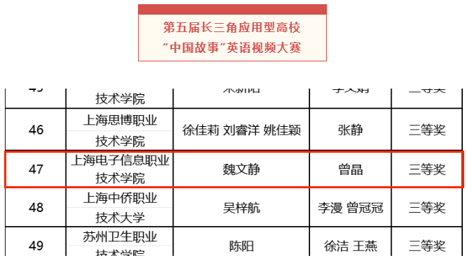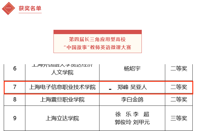 近日,第四届长三角应用型高校“中国故事”教师英语微课大赛、第五届长三角应用型高校“中国故事”英语视频大赛结果公布。我校师生获得二等奖1项、三等奖3项。