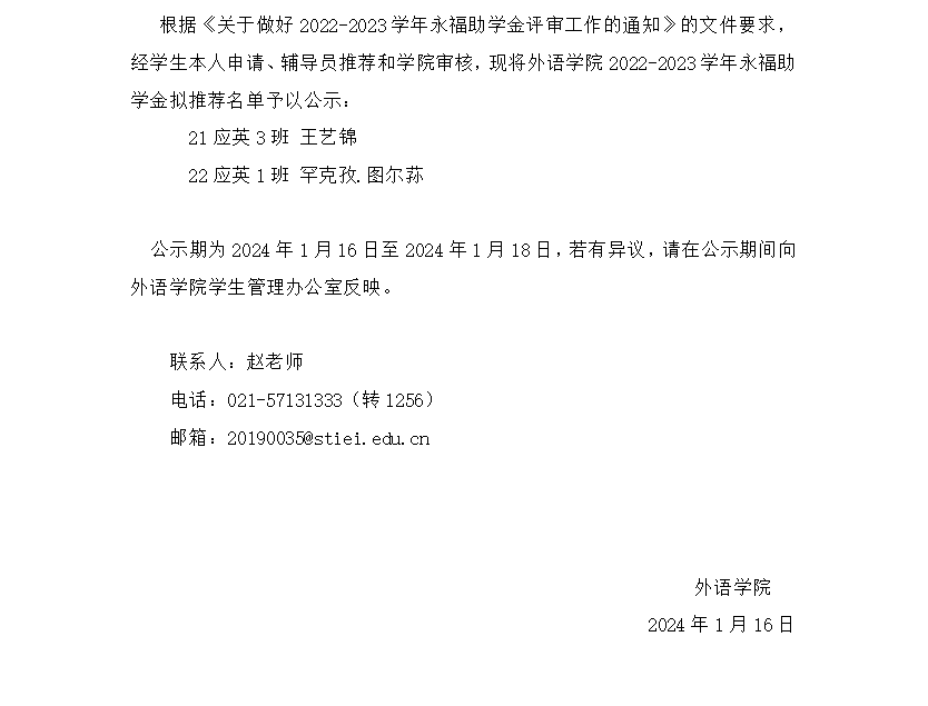 外语学院2022-2023学年永福助学金拟推荐名单公示