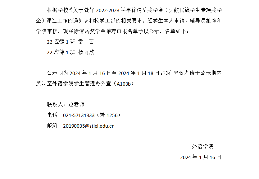 外语学院2022-2023学年徐渭岳奖学金推荐申报名单公示