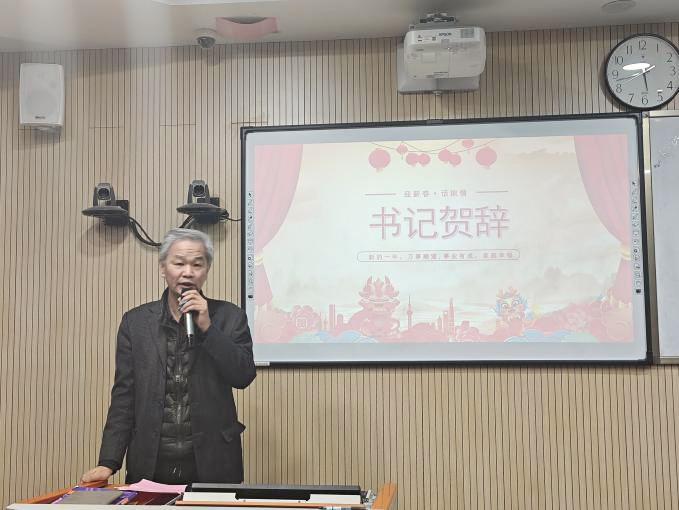 外语学院直属党支部书记吴亚人老师代表学院党政班子向教职工致了新春贺词,感谢大家过去一年的努力付出和做出的成绩,希望全体教师团结一致,携手并肩、共同努力,实现更加美好的明天。