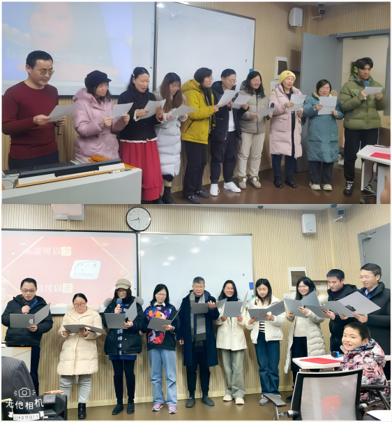 随后精彩的文艺表演和有趣的互动游戏穿插进行。应用英语系带来的歌曲《相亲相爱一家人》拉开了节目的序曲。德语系师生以一曲《如愿》表达了对祖国、对家乡的爱,卓宁东老师的独唱《这世界那么多人》把温暖带给了每一位教职工。诗歌朗诵《你好,新年》《龙之歌》让大家感受到了祖国大好河山的激情豪迈。ESP教研室带来的集体朗诵《上班使我快乐》融合了外语学院拼搏上进、努力争优的工作作风,活泼欢快的配音效果让所有老师都记忆深刻。最后,一曲综合行政办公室老师带来的《相亲相爱》升华了外语学院教师大爱无疆、四海共赢的新格局。