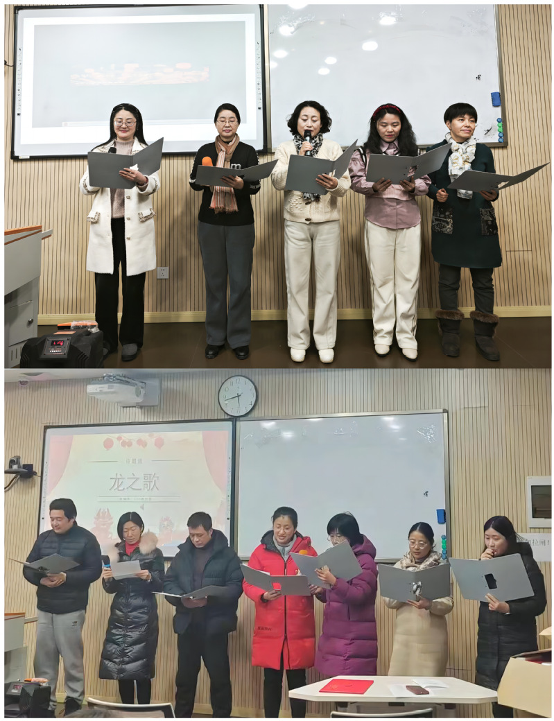 随后精彩的文艺表演和有趣的互动游戏穿插进行。应用英语系带来的歌曲《相亲相爱一家人》拉开了节目的序曲。德语系师生以一曲《如愿》表达了对祖国、对家乡的爱,卓宁东老师的独唱《这世界那么多人》把温暖带给了每一位教职工。诗歌朗诵《你好,新年》《龙之歌》让大家感受到了祖国大好河山的激情豪迈。ESP教研室带来的集体朗诵《上班使我快乐》融合了外语学院拼搏上进、努力争优的工作作风,活泼欢快的配音效果让所有老师都记忆深刻。最后,一曲综合行政办公室老师带来的《相亲相爱》升华了外语学院教师大爱无疆、四海共赢的新格局。