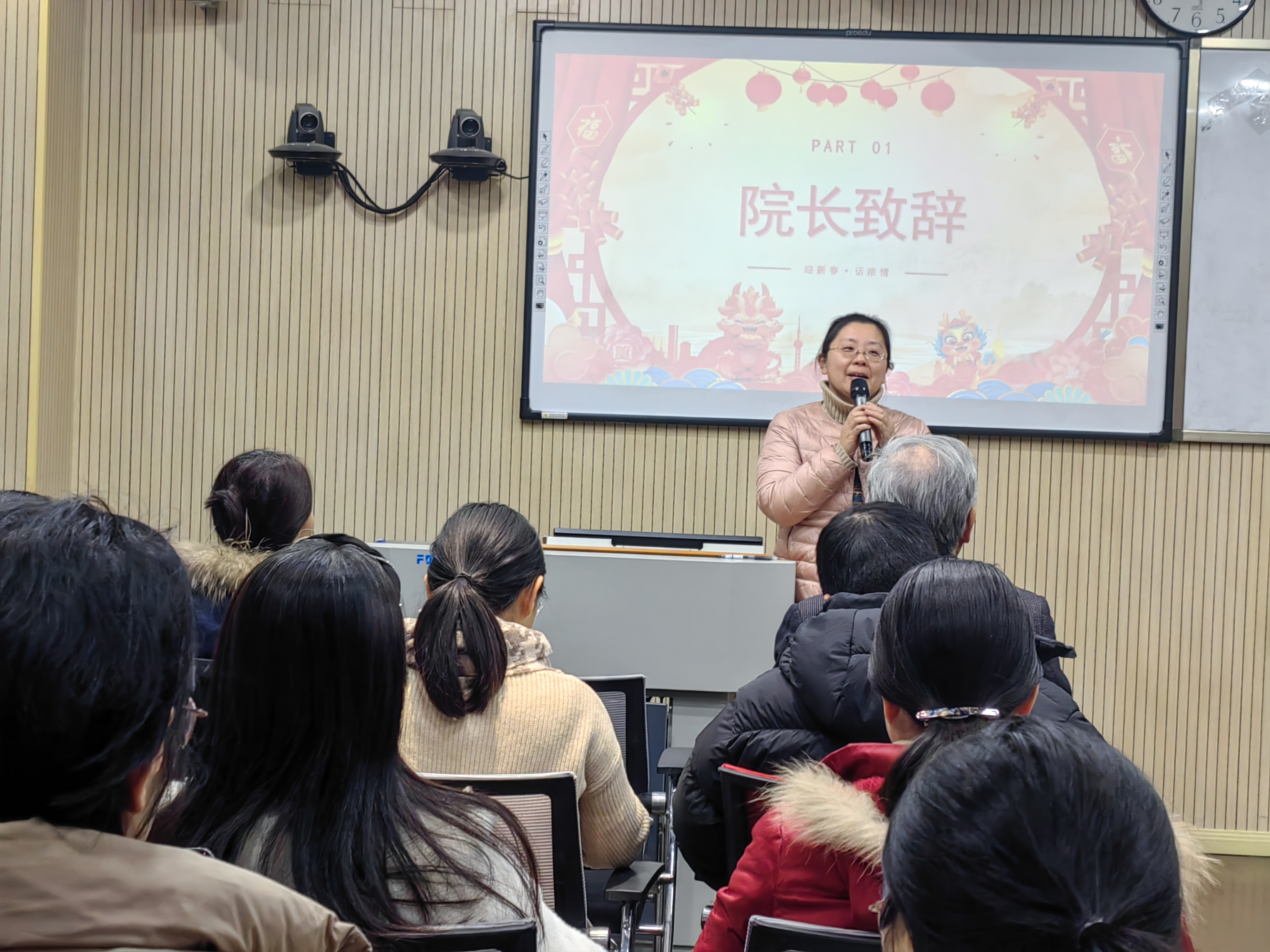 外语学院直属党支部书记吴亚人老师代表学院党政班子向教职工致了新春贺词,感谢大家过去一年的努力付出和做出的成绩,希望全体教师团结一致,携手并肩、共同努力,实现更加美好的明天。