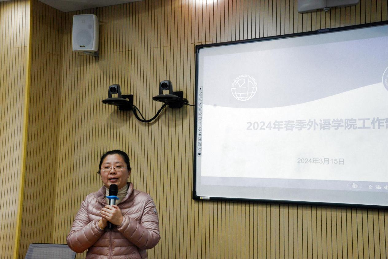 会中,院长肖潇作“24年外语学院工作任务和重点”工作报告,部署外语学院本年度工作及重点。她强调,外语学院要深入学习习近平总书记考察黑龙江重要讲话精神及两会政府报告关于”新质生产力”的论述,贯彻落实教育部等四部门关于“数字教育”的论述,以学校职业本科申办为主线,以学校新一轮双高院校申报为契机,以外语学院特色发展为重点,加强党建引领、提升专业特色及内涵、优化专业布局、完善内部考核评价标准、推动干事创业,构建“项目为王,特色为王,成果为王,过程为王,人人有项目,人人有发展”的外语学院高质量发展工作风向标和考核重点。全体教职员工一要转变理念,摒弃等、靠、要思维,主动思考,主动作为。二要抓住契机,积极谋划参与学校“双高”申报,重点落实6个方面,10项重点任务。三要紧盯学科前沿,提升教师数字素养,积极应对人工智能、语言大模型、智能化制造对外语学科的挑战变革,积极推进数字化课程建设,拓展教师数字化教学应用,提升教学能级。四要深化产教融合,面向上海产业布局,优化外语专业及课程布局,开设更多具有实际效用的产教融合项目,拓展专业和课程的维度。五提升科研能级,着力思考、探索、实施外语与科普相结合,语言和技术相结合教学和研究,提升外语教学和研究新质生产力。