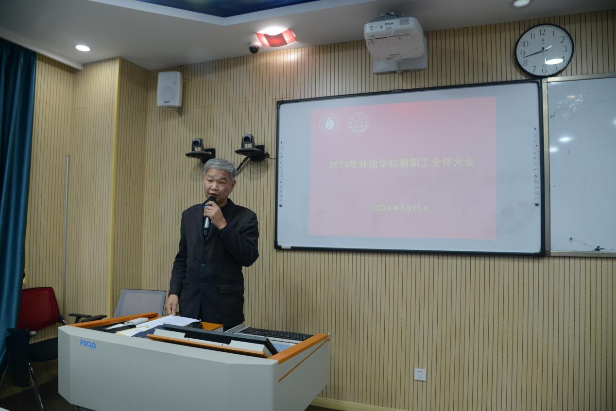 3月15日下午,外语学院2024年教职工全体大会在奉贤校区A110报告厅召开。学院全体教职员工参加会议。会议由外语学院院长肖潇主持。