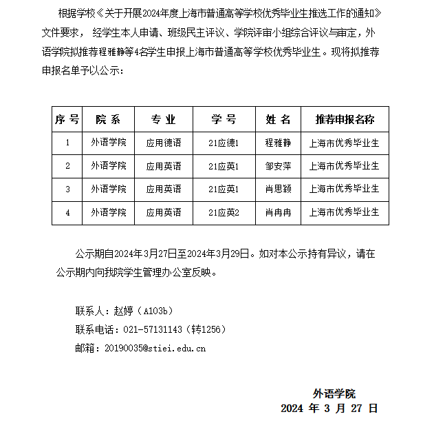 2024年度外语学院拟推荐上海市普通高等学校优秀毕业生名单公示