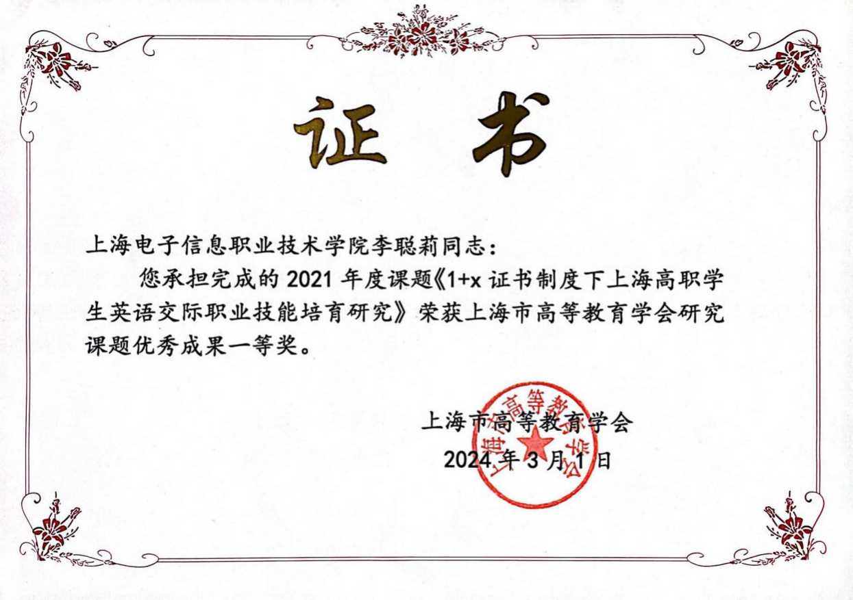 3月16日, 上海市高等教育学会2024年学术年会在同济大学隆重召开,由我校外语学院李聪莉老师承担完成的2021年度上海市高等教育学会研究课题荣获优秀成果一等奖,是唯一获得一等奖的高职院校,体现出外语学院教师在教育科研方面较高的学术水平。