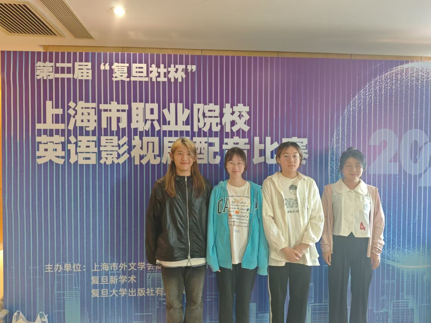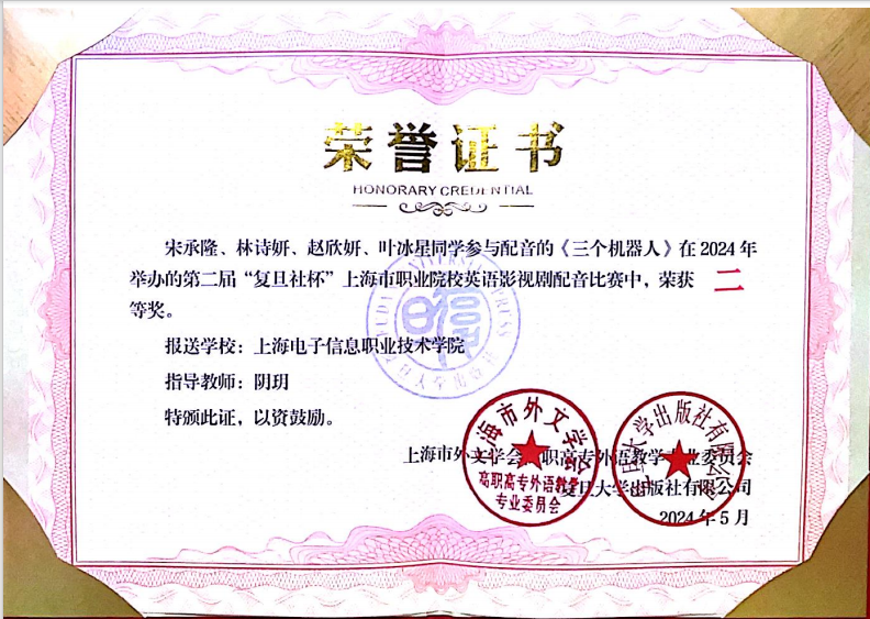 5月18日,由上海市外文学会高职高专外语教学专业委员会联合“复旦新学术”、复旦大学出版社,以“科技强国”为主题,举办了第二届“复旦社杯”上海市职业院校英语影视剧配音比赛。我校阴玥老师指导的宋承隆、林诗妍、赵欣妍、叶冰星同学的作品《三个机器人》获得二等奖,孙辉老师指导的刘佳伟、王婧雅同学作品《超能陆战队》获得三等奖,牟云红老师指导的周祎、高雨萌同学的作品《模仿游戏》获得三等奖。