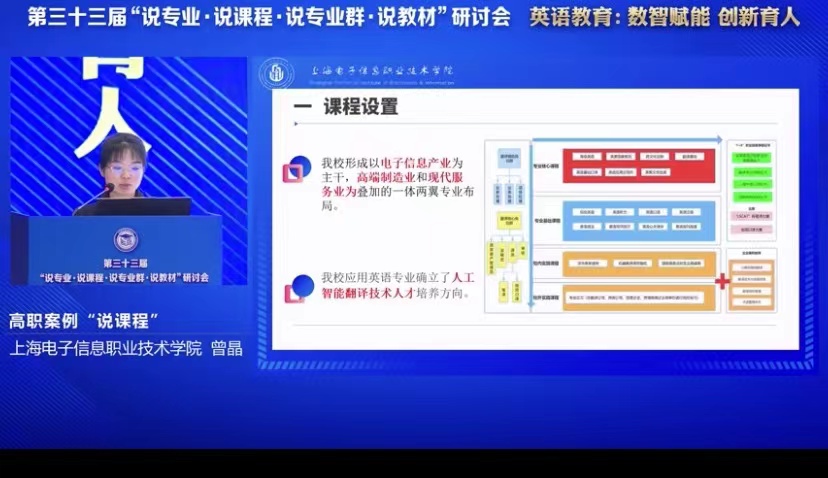 我院英语系专任教师曾晶的说课程案例“产教融合背景下的英语听说课程数字化体系构建”成功入选,作为说课代表参会发言。案例围绕我院应用英语专业机器翻译技术人才培养目标,详细阐述了英语听说课程如何构建数字化课程体系、如何实现“岗课赛证”融合、如何深化校企合作和产教融合,对我院探索“英语+”创新型复合型应用英语专业人才的培养具有一定的启示意义。