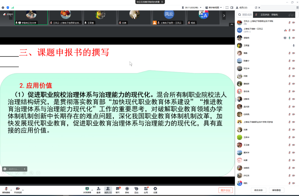 讲座由学院李聪莉副教授担任主讲人,围绕《职业教育类科研课题的申报与科研研究》主题展开了精彩的分享。李老师结合项目案例,就职教类项目的选题、文献综述、研究内容框架搭建、研究重点难点、课题方法设计、进度安排与保障条件、预期成果以及表述方式、写作技巧等各方面进行了详尽的讲解。讲座内容案例丰富多样,给青年教师们提供了很多实用的课题申报与研究的启发,收获满满。讲座后,多位老师也表示要主动学习课件,继续针对科研选题、项目申报等主题进行深入的相互交流与探索。