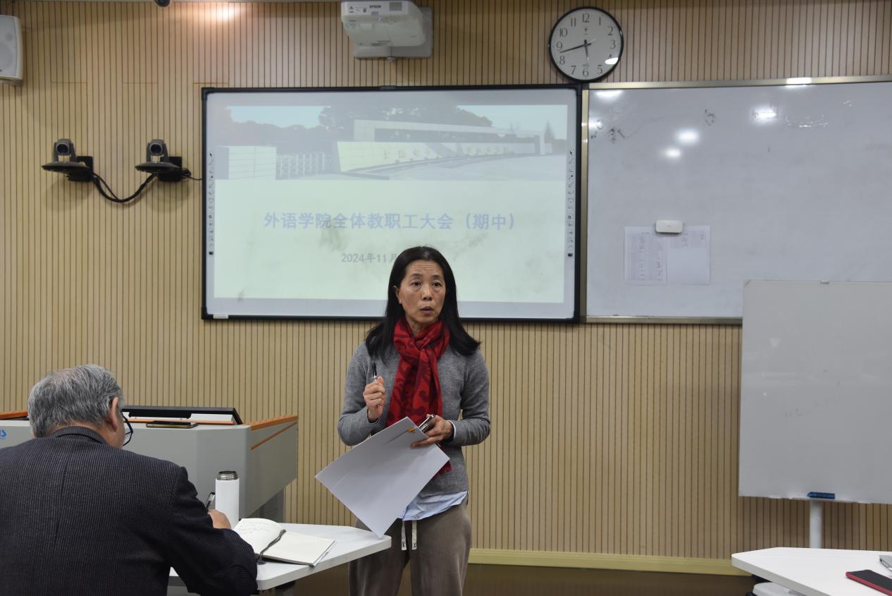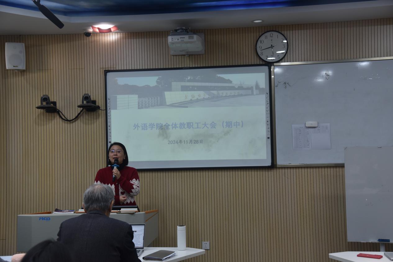 外语学院于2024年11月28日召开了学院全体教职工大会对年度目标的全景式进展情况进行全面梳理,启动考核工作的相关程序。学院党政领导与全体教职工参加了会议。