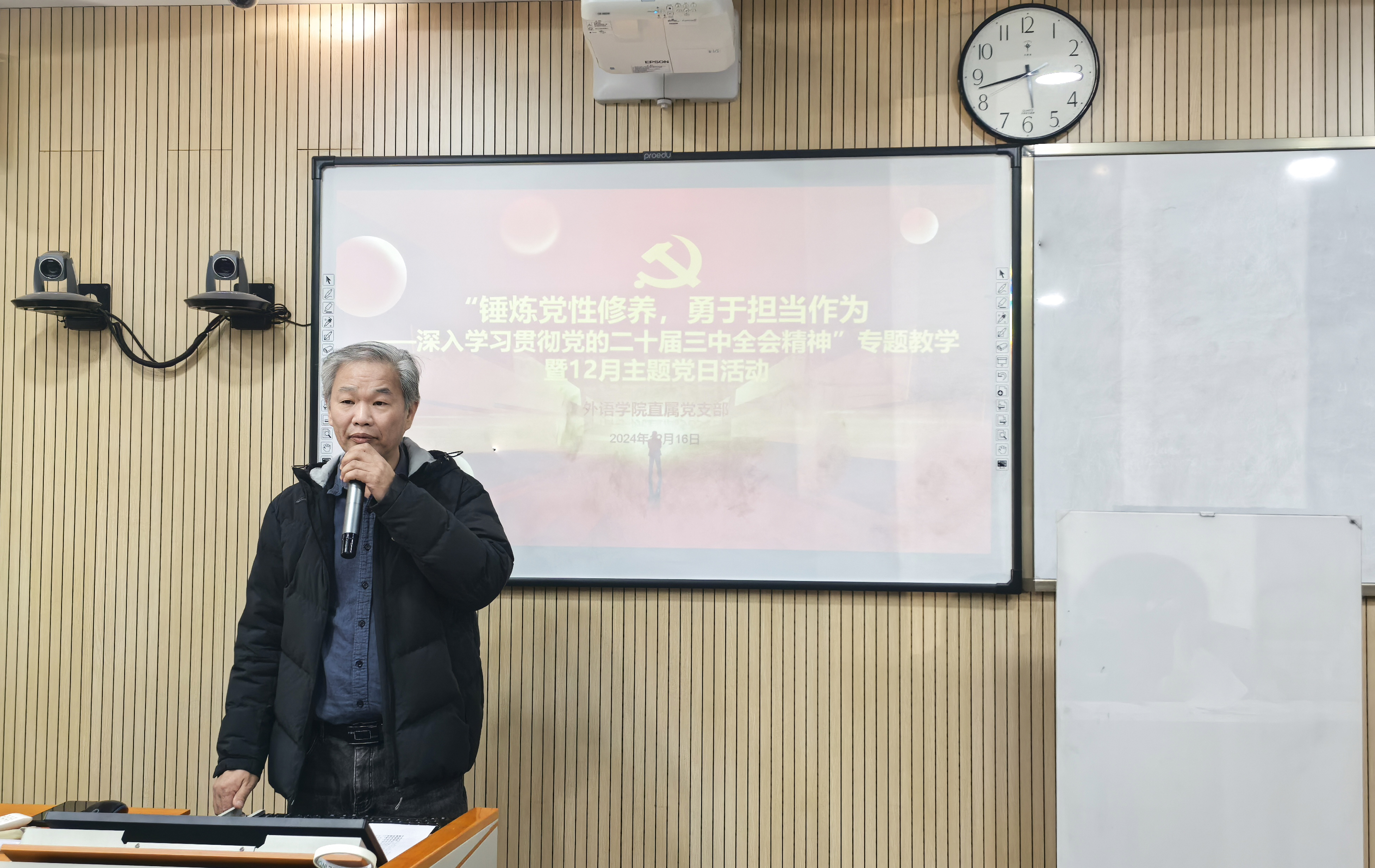学习好贯彻好党的二十届三中全会精神,是当前和今后一个时期全党全国的一项重大政治任务。为此,外语学院直属党支部贯彻学校党委的学习要求,于1216日下午在A110开展“锤炼党性修养,勇于担当作为——深入学习贯彻党的二十届三中全会精神”专题教学暨12月主题党日活动。邀请马克思主义学院形势与政策教研部主任谢国日老师作理论宣讲。活动由外语学院直属党支部书记吴亚人人主持,学院全体党员参加培训。