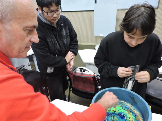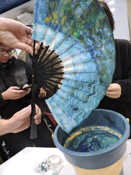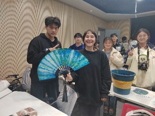 课堂上,孙辉老师带领中外师生共同制作的漆扇展现了独特的艺术风格和个人特色,通过色彩的渐变和层次的叠加,展现了丰富的视觉效果。制作者的笑容和专注的神情,传达了对漆扇制作艺术的热爱和对中国文化的尊重。