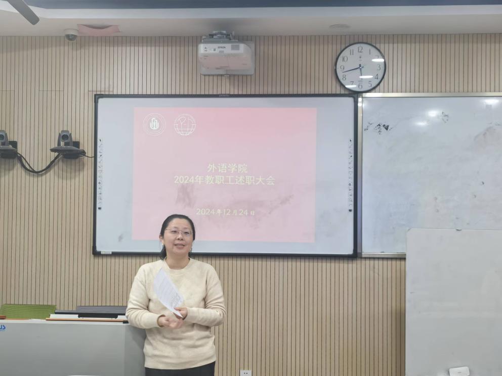 为深入贯彻落实党的教育方针,进一步加强和改进外语学院教职工队伍建设,全面总结2024年工作成绩与经验,切实提高全体教职工的履职能力和敬业精神,2024年12月24日,外语学院全体57名教职工举行了年终教职工述职大会。此次大会由学院直属党支部副书记、院长肖潇同志主持,充分体现了学院对教职工队伍建设的高度重视。