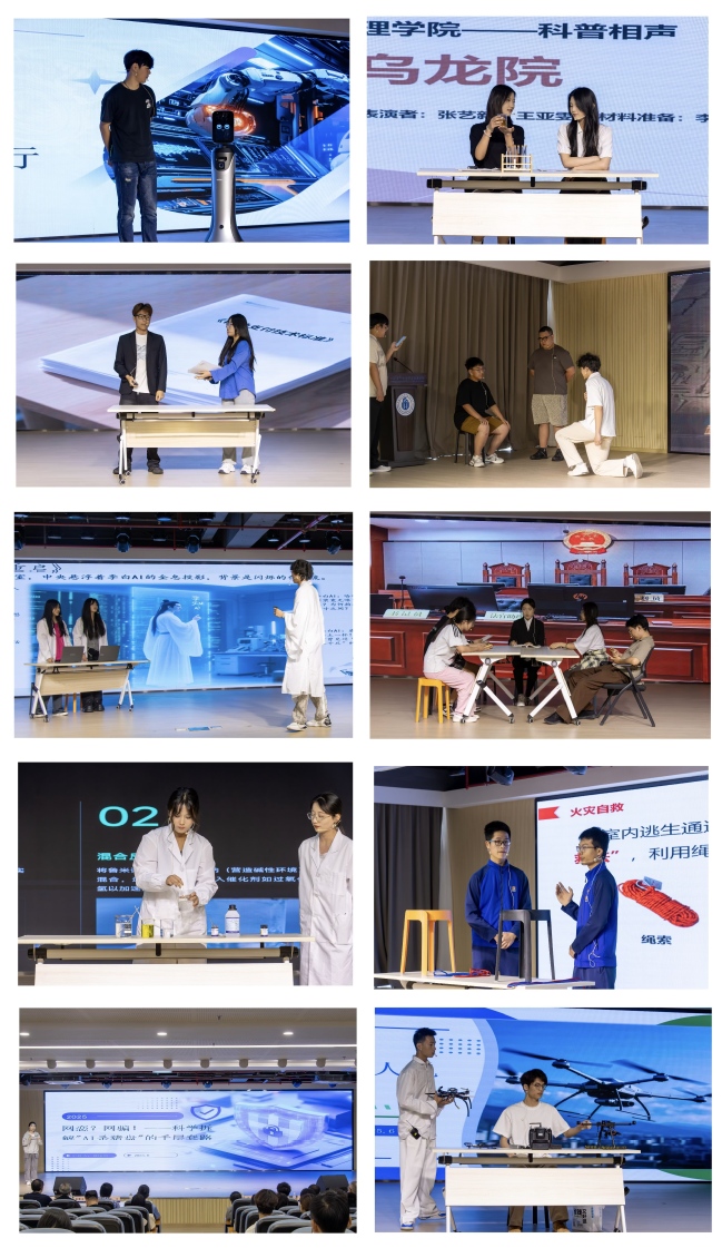 经各二级学院初赛选拔推荐,10组节目入围决赛。参赛团队紧扣“机器人互动”“化学实验”“AI对话”“消防逃生”“知识产权”“反诈识骗”“无人机科技”“NFC技术”等科技热点,通过情景剧、舞台秀、实验演示等形式,将科技知识与艺术表达深度融合,赢得阵阵掌声。