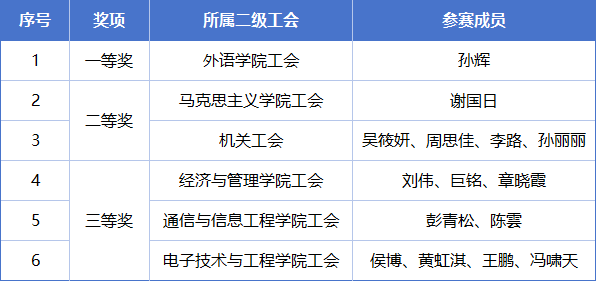 经过激烈比拼,大赛共评比出一等奖1项,二等奖两项,三等奖3项。获奖名单如下: