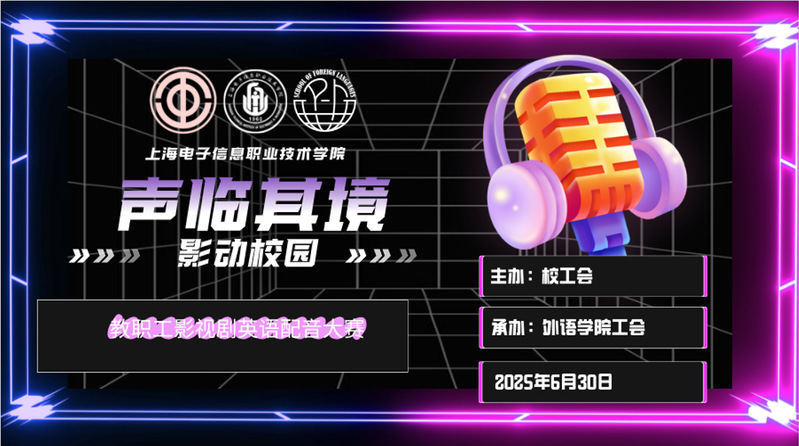 6月30日,学校工会2025年“一家一品”项目——“声临其境 影动校园”教职工影视剧英语配音大赛在奉贤校区C108报告厅举行。本次大赛由学校工会主办、外语学院工会承办。学校党委副书记、副院长、校工会主席张涛出席并致辞,校工会、外语学院等部门负责人参与活动。来自各二级工会的9组选手参与了激烈角逐。