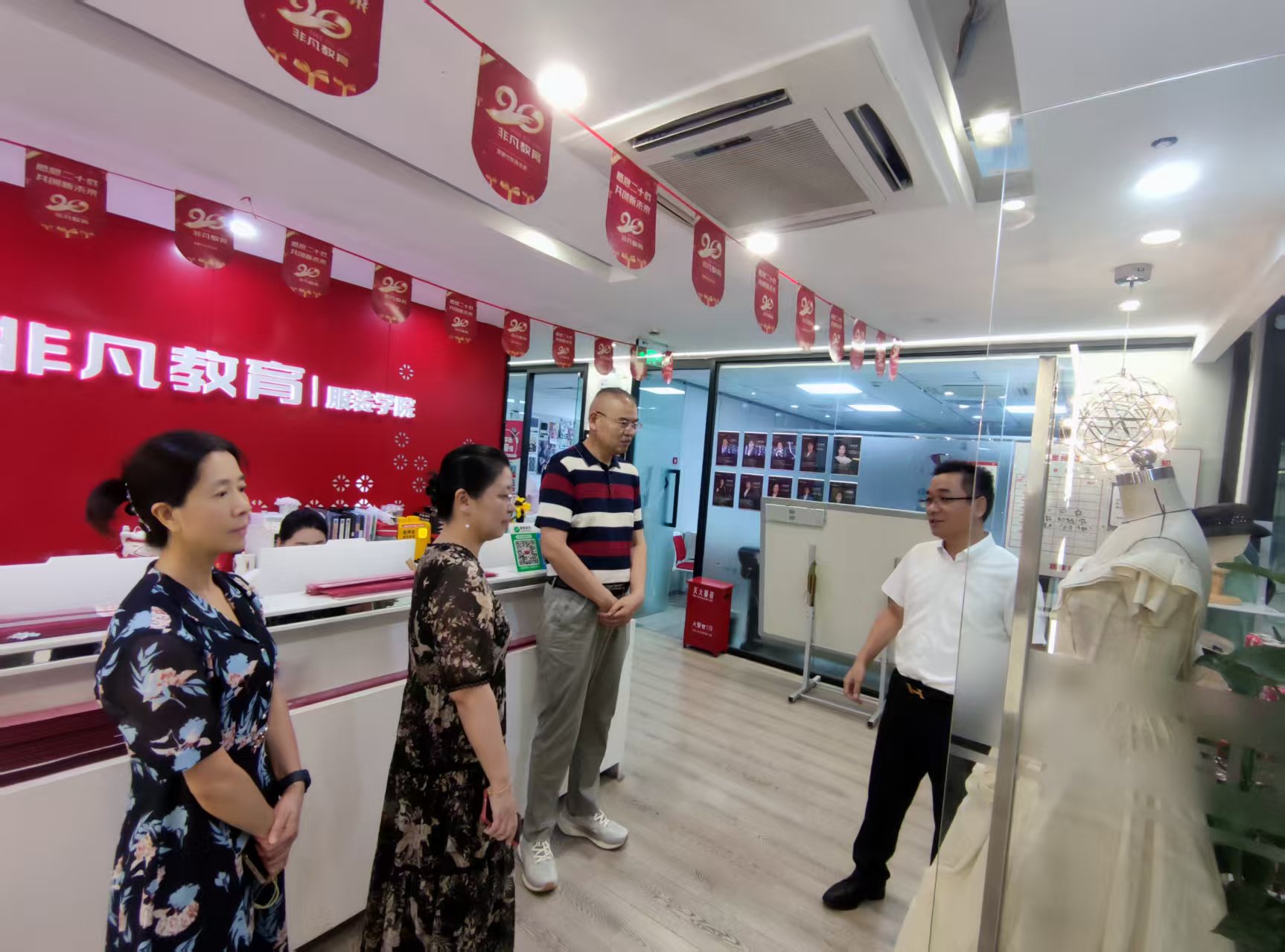 在非凡教育党支部书记、院长董恩海,副院长余成龙的陪同下,外语学院团队实地参观了非凡教育的现代化教学环境与实训基地,详细了解了其在职业技能培训领域的硬件设施、课程体系及人才培养模式。肖潇院长对非凡教育“以就业为导向”的办学理念和产教融合实践成果表示高度赞赏,认为其经验为高职院校应用型外语人才培养提供了宝贵参考。