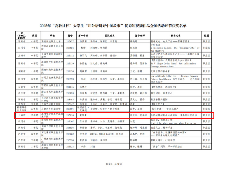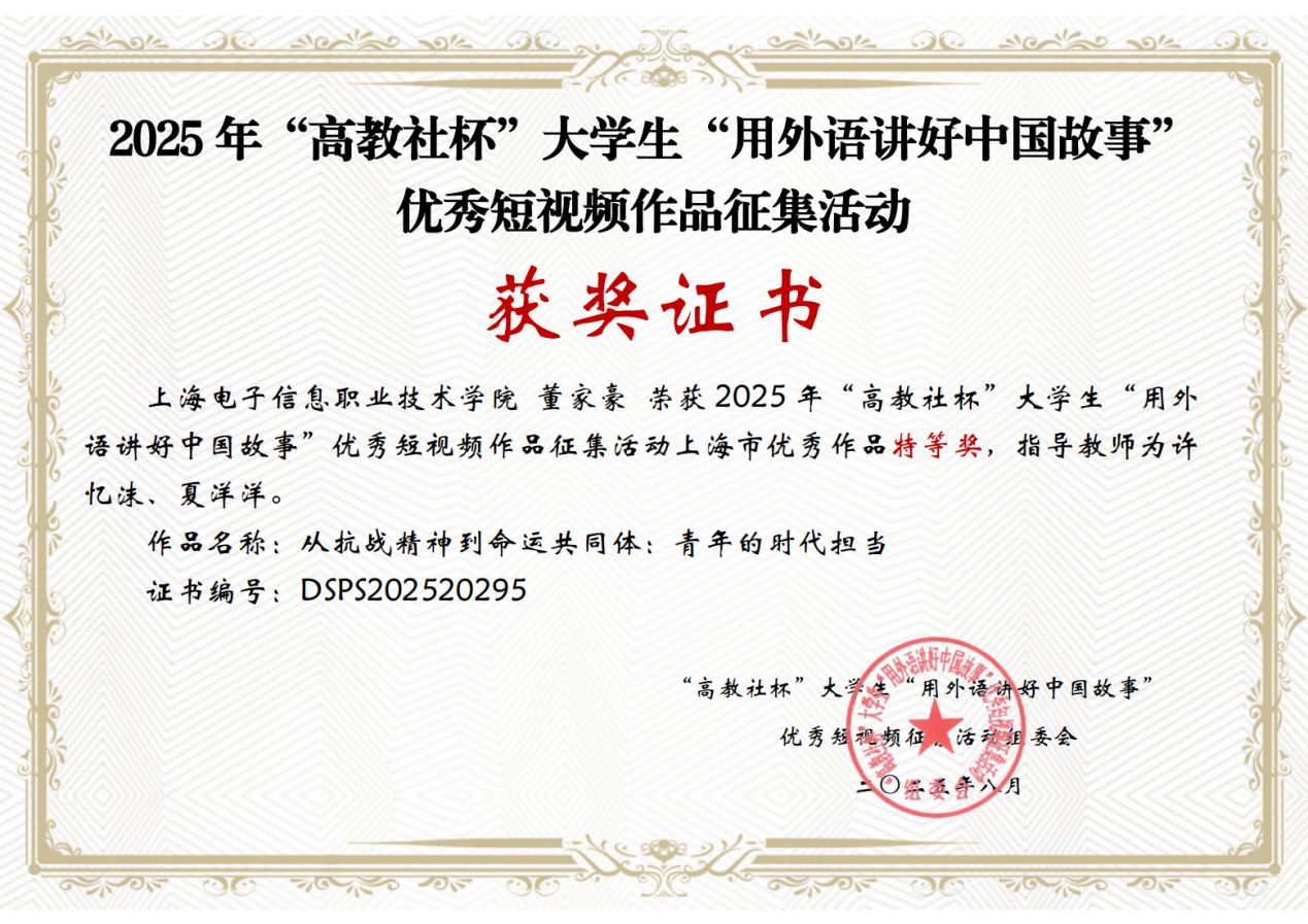 近日,2025年“高教社杯”大学生用外语讲好中国故事短视频大赛全国总决赛圆满落幕。外语学院许忆沫、夏洋洋两位老师指导的学生董家豪,凭借作品《从抗战精神到命运共同体:青年的时代担当》,在众多参赛者中表现优异,先后斩获上海市特等奖、全国总决赛二等奖。