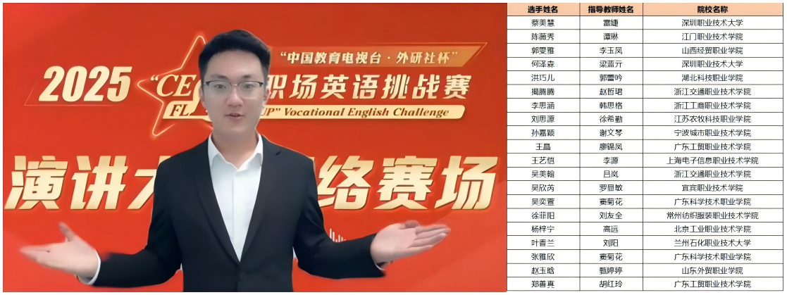 近日,“中国教育电视台·外研社杯”职场英语挑战赛演讲大赛网络赛场决赛圆满落幕。本届赛事吸引全国千余名学子参与,经过多轮激烈角逐,外语学院应用英语专业王艺恺同学脱颖而出,荣获特等奖并成功晋级全国总决赛。