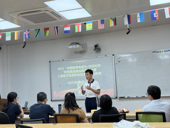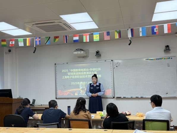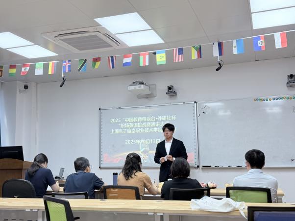 为深入贯彻落实党的二十大精神,推动职业教育高质量发展,提升学生的国际视野与职业英语应用能力,由外语学院与创新创业(世赛)学院联合承办的2025年“中国教育电视台·外研社杯”职场英语挑战赛演讲大赛上海电子信息职业技术学院选拔赛于10月13日下午在我校奉贤校区A106教室成功举办。外语学院副院长邓玉华出席了本次比赛,外语学院金钊、刘稳良、张蕾、孙辉、司梦琪五位教师担任现场评委。