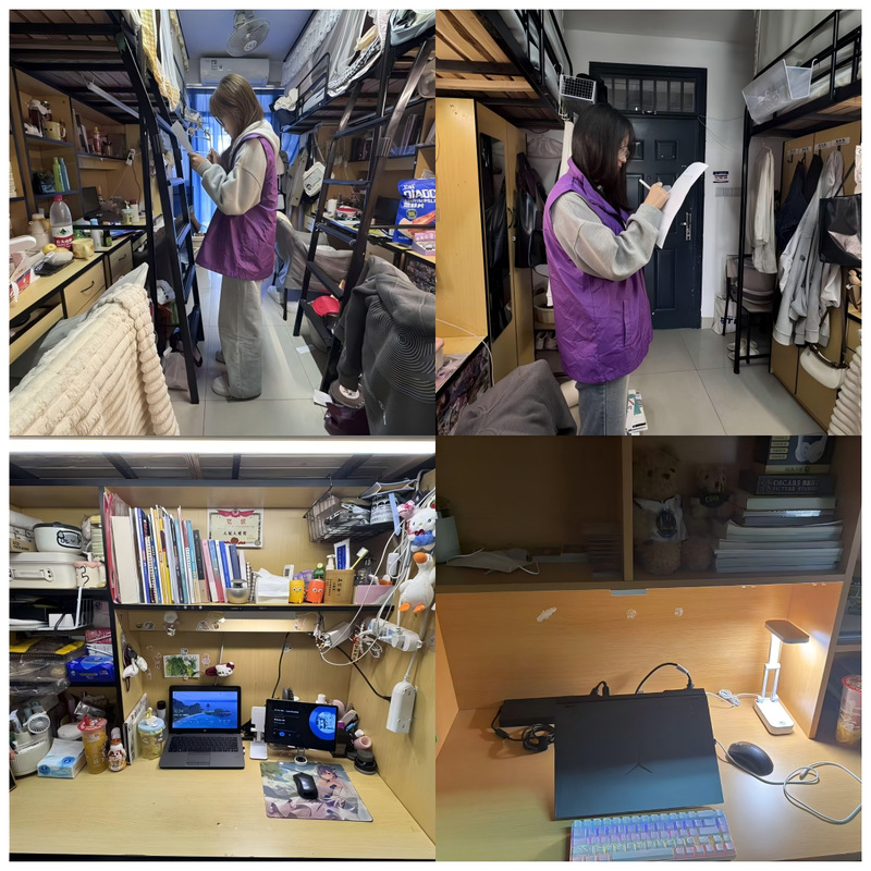 活动覆盖学院6栋学生宿舍楼,每周固定时间由经招募培训的楼栋专属志愿者,围绕卫生整洁、物品摆放、文明行为、无违规情况四大维度开展督导检查。10月29日晚,志愿者按楼栋分组,于指定时段对全院6栋宿舍楼完成首轮集中督导,现场对照评分标准逐项打分、即时说明扣分原因,经允许后记录问题情况,并通过“督导沟通群”发布楼栋简报,形成“检查—反馈—整改—复查”的闭环管理。