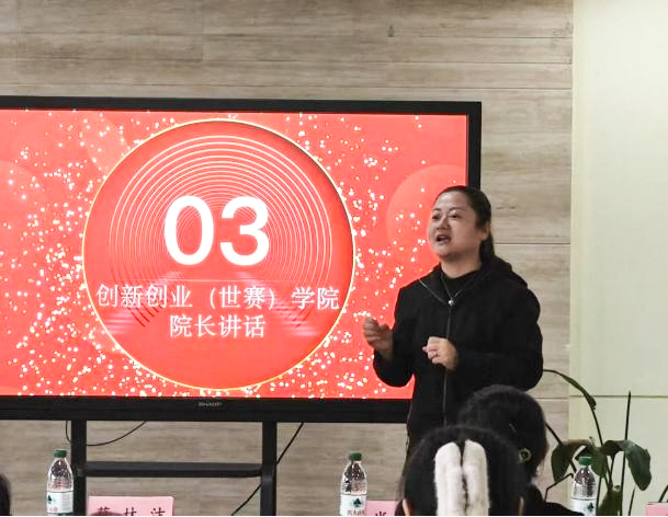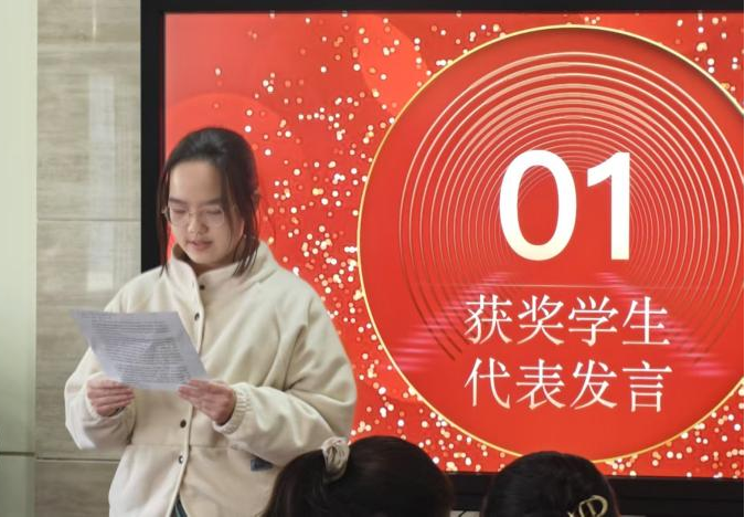 获奖指导教师代表陈婷华发言。她分享了指导学生备赛的点滴历程,感谢学院为师生搭建的优质平台,并表示将继续深耕教学、用心指导,助力更多学子在竞赛中成长成才。