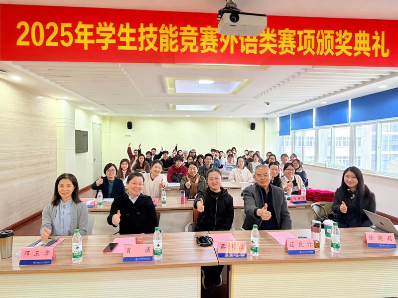 为表彰先进、树立榜样,激励全院学子在学科竞赛中勇攀高峰,12月1日外语学院2025年学生竞赛颁奖典礼在A205会议室举行。创新创业(世赛)学院院长蔡林洁,外语学院直属党支部书记、院长肖潇,副书记、副院长茌良计,副院长邓玉华,各专业和学部主任、教师代表,以及在多项赛事中斩获佳绩的获奖学生及其指导教师出席典礼。典礼由学生比赛负责人徐晓莉主持。