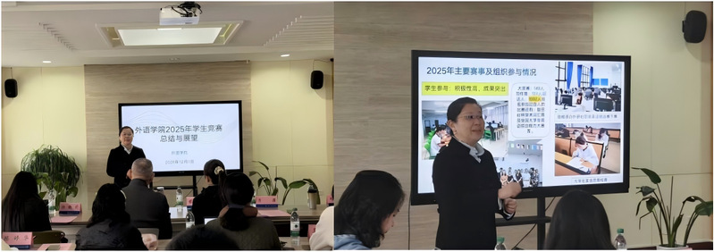 蔡林洁作总结讲话。她对外语学院在2025年学生竞赛中取得的优异成绩表示热烈祝贺,对获奖学子和指导教师的辛勤付出给予肯定。同时,她鼓励全体学子以获奖同学为榜样,勇于挑战自我、积极参与各类竞赛,在实践中提升专业技能与综合素养,为未来的职业发展打下坚实基础。