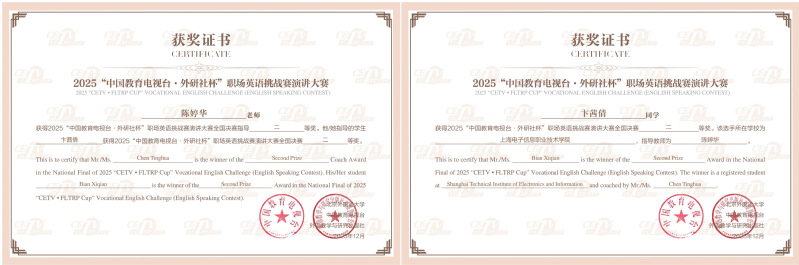 12月21日,2025“中国教育电视台・外研社杯” 职场英语挑战赛演讲大赛在北京圆满收官。我校学子卞茜倩作为上海赛区唯一晋级北京线下决赛的选手,凭借扎实的语言功底、沉稳的赛场表现,一路过关斩将,最终斩获全国二等奖,指导教师陈婷华获全国决赛指导二等奖!